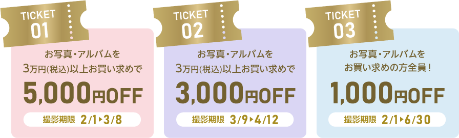 撮影時期によって使えるチケットが異なる3枚綴りのチケットを無料プレゼント🎁