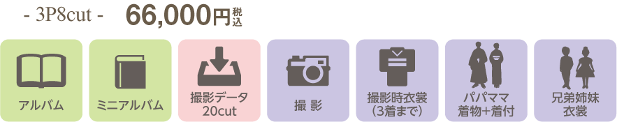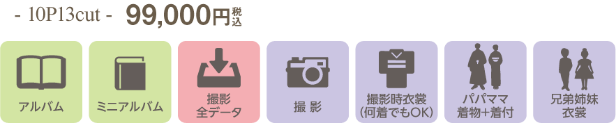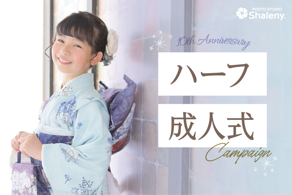 【ハーフ成人式キャンペーン】記念写真はシャレニーへ! 2025.12.02キャンペーン ハーフ成人式フォトを撮ろう! ハタチの2分の1になる10歳を迎えたことを祝って、ハーフ成人式フォトを撮影しませんか?お子さまの成長の節目を記念としてお写真に残しましょう! 撮影期間 2026年1月2日(金)~3月31日(火) キャンペーン特別プラン キャンペーン中なら、とってもお得!通常価格 5,500円(税込)▼なんと0円!〈撮影+衣裳+ヘアメイク+着付〉 ※1枚目はお一人写しに限ります。 お得な特典もついてきます! 特典1 ユニフォーム・習い事衣裳・趣味のもの持込撮影無料! ※お着替えしたお写真は1枚以上ご購入をお願いいたします。 特典2 ドレス・タキシードへのお着替えOK! ※お着替えしたお写真は1枚以上ご購入をお願いいたします。 特典3 A4デザインフォト1枚プレゼント! ※11,000円(税込)以上お買い求めの方が対象です。※お買い求めいただいたお写真でおつくりいたします。 選べるセットプラン ハーフ成人式フォトのお写真はアルバムやデータでしっかり残しましょう!下記よりお好きなプランをお選びいただけます。また、お写真やデータは1枚から購入も可能です。 データ20カットプラン 撮影したお写真をデータでしっかり残したいという方には20カットプランがおすすめです。SNSでの使用や自作のアルバム作成などお客様のお好みでお使いいただけます。 ご家族様やご親戚様へ撮影したお写真を簡単に共有できるのもデータならではの魅力。※兄弟姉妹でまとめることはできません。※衣裳の追加は1着3,300円(税込)です。 ベーシック+データ20カット アルバム収録の修整済みデータ3カットとデータ20カットがセットになったプラン。表紙はブラックとホワイトの2色からお選びいただけて、すっきりとしたデザインは写真館ならではの仕上がりです。※兄弟姉妹で1冊にまとめることはできません。※衣裳の追加は1着3,300円(税込)です。 マイン+データ20カット アルバム収録の修整済みデータ5カットと撮影データ20カットがセットになったプラン。 表紙はふんわりとした素材を使用していて可愛い仕上がり。見開きの中は銀塩タイプで耐久性が高く色あせしにくいしっかりとした加工がされています。※兄弟姉妹で1冊にまとめることはできません。※衣裳の追加は1着3,300円(税込)です。 クローバー+データ20カット アルバム収録の修整済みデータ8カットとデータ20カット、ミニアルバムが付いた大人気プラン。表紙は5色からお選びいただけます。パパママ着物+着付と兄弟姉妹の衣裳も含まれていて嬉しいプランです。※兄弟姉妹で1冊にまとめることはできません。※衣裳の追加は1着3,300円(税込)です。※兄弟姉妹衣裳を和装で希望の場合、着付料金別途2,200円(税込)です。 ディア+撮影全データ アルバムとミニアルバム、全データがセットになったプラン。キャンパスボードのようなぬくもりのあるかわいい1冊。アルバムのカバー付きで、カバーにも表紙と同じデザインが入ります。パパママ着物+着付と兄弟姉妹の衣裳も含まれていて嬉しいプランです。※兄弟姉妹衣裳を和装で希望の場合、着付料金別途2,200円(税込)です。 ハーフ成人式限定アルバムSweet10 ハーフ成人式の撮影したお写真と、お持ちのカメラやスマホで撮影した10年間のお子さまのお写真が1冊で残せるアルバム「Sweet10アルバム」。 お持込みの写真は10枚、スタジオ撮影の写真は28枚、合計38枚が1冊に!さらにスタジオ撮影の購入データがついてとってもオトク✨ その子らしさをいっぱい詰め込んだ、世界で一冊のオリジナルアルバムを作りませんか? [size] ハードタイプ:170×216mm 特別価格 55,000円(税込) Sweet10ってどんなアルバムなの? ページの中には今のお子さまらしさがいっぱいです!一部のページをご紹介♪ プロフィールページには、お子さまご自身が書いたものをそのまま掲載! 成長記録のページでは、赤ちゃんの頃からの成長を残せます。 好きな物や宝物と一緒にパチリ! 将来の夢も残せます! 今夢中になっていることも残せます! 当日の持ち物は? せっかくのハーフ成人式。お着物姿やドレス、タキシード姿を残すだけではなく、「今はまってるもの」「好きなこと」「大事にしているもの」「小さいときからの宝物」など、一緒に写真に残すことでより特別な記念日になりますよ。 写真を撮るならキャンペーンがチャンス! ハーフ成人式フォトを撮影するならキャンペーン期間がオススメ!予約が埋まってしまう前に、お早めにお店にお問合せくださいね!